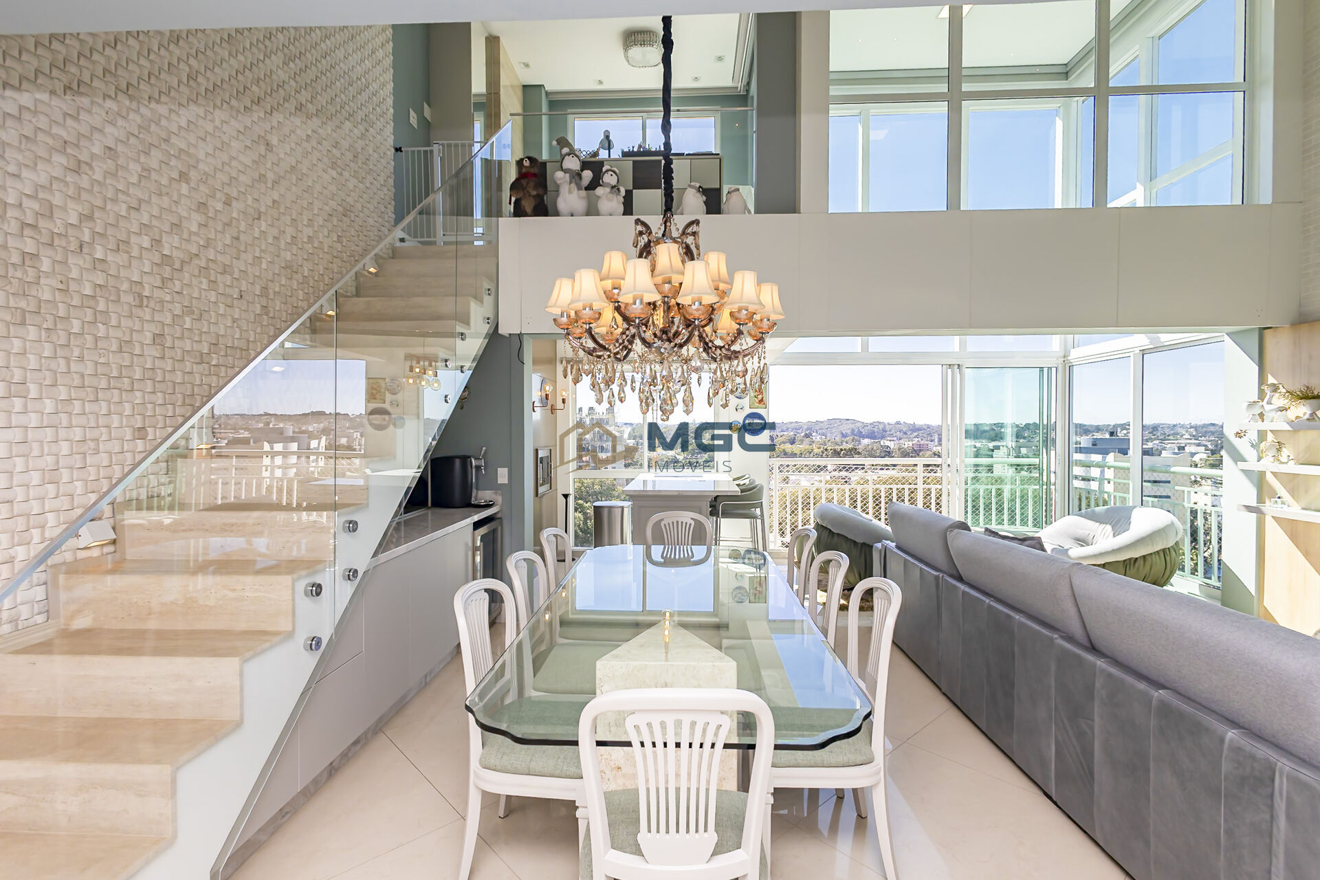 A sala com pé direito duplo, integrada à sala de jantar e churrasqueira, cria um ambiente imponente, iluminado e acolhedor, ideal para receber bem e viver melhor.