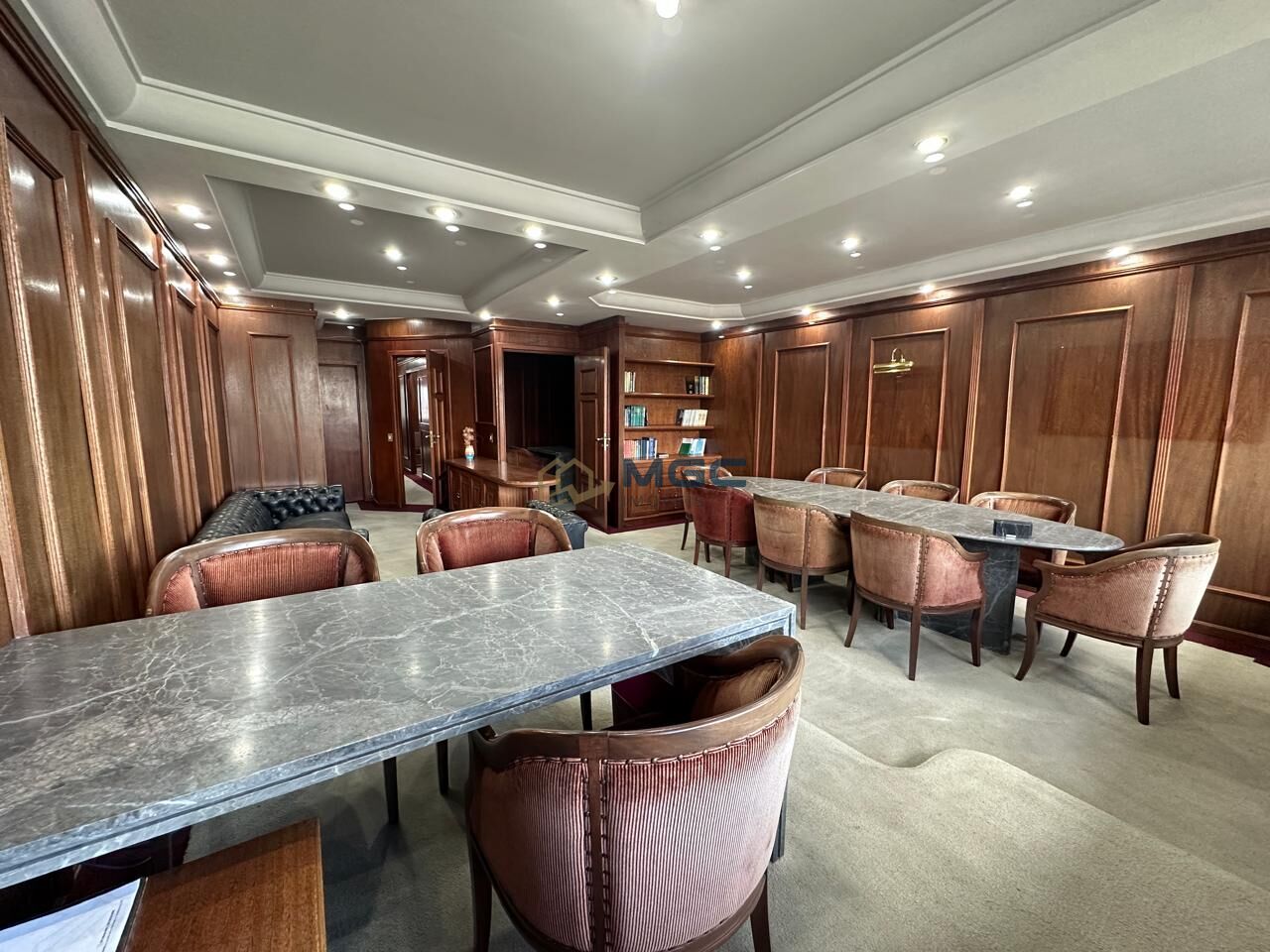 - Acabamento em madeira nobre, com estantes embutidas e mesas em mármore
